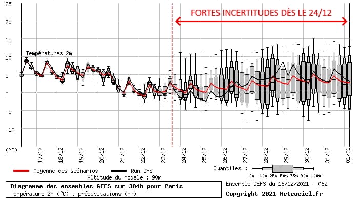 D'ailleurs, un simple coup d'oeil aux diagrammes des différents scénarios permet d'illustrer l'ampleur des incertitudes pour la période des fêtes. Le diagramme ci-dessous, valable pour Paris, montre de très faibles écarts entre les scénarios jusqu'au 23 décembre 2021 avant que ceux-ci ne partent dans tous les sens à partir du Réveillon de Noël ! Pour la fin de l'année, il y a une vingtaine de degrés d'écart entre les scénarios les plus froids et les scénarios les plus doux - montrant à quel point les modèles peinent à savoir où se situera le conflit de masses d'air. Dans ce contexte, il est prématuré de dire quelles seront les régions dans l'air froid et quelles seront les régions dans l'air doux.