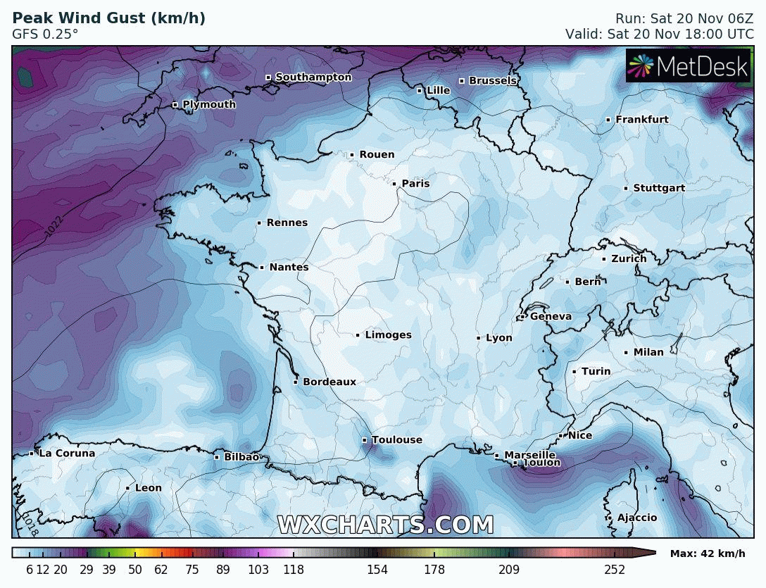 Rafales de vent en France entre le samedi 20 et le mercredi 24 novembre 2021 - Modèle GFS via WX CHARTS