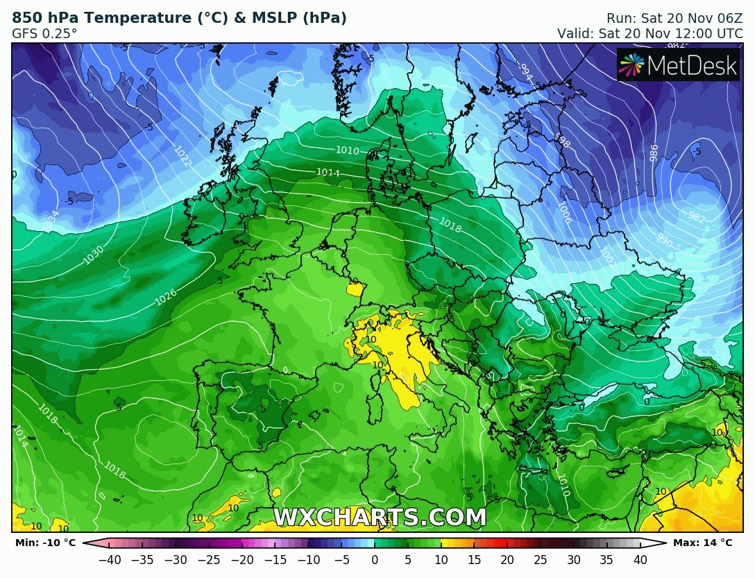 Animation des températures à 850 hPa sur l'Europe entre le samedi 20 et le mercredi 24 novembre 2021 – Modèle GFS via WX CHARTS