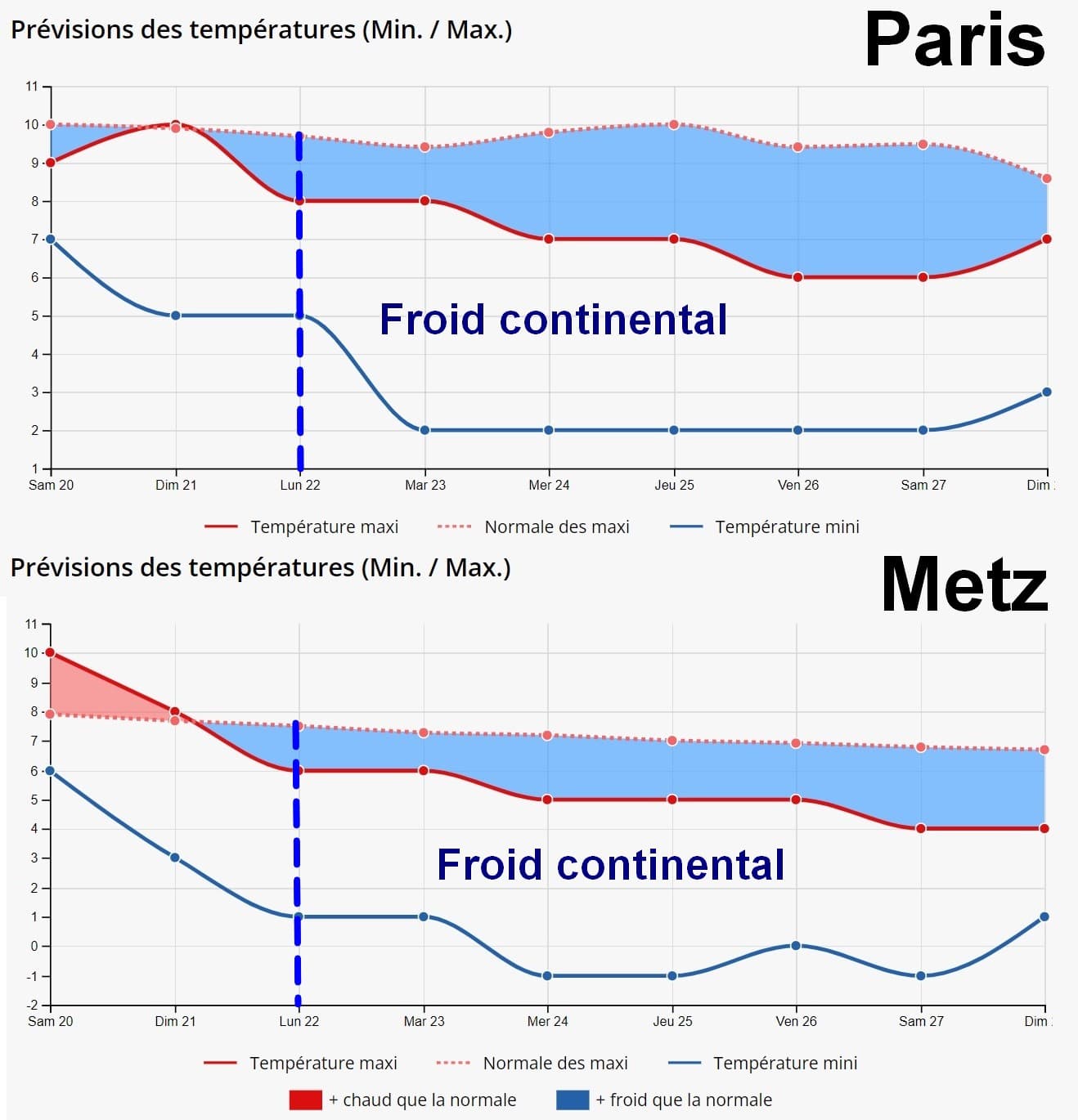 Evolution des températures minimales et maximales dans les 15 prochains jours pour Paris et Metz - Météo-Villes