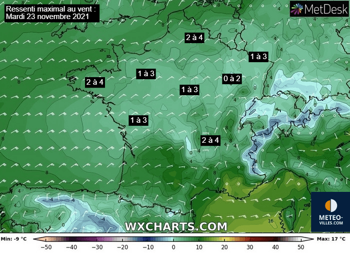 C'est néanmoins durant la journée de mardi 23 que le ressenti devrait se montrer le plus hivernal. Le vent sensible soufflant continuellement sur de nombreuses régions du Nord devrait en effet apporter des valeurs basses des côtes Atlantiques au Nord, restant parfois inférieures à 0 sur le Nord-Est.