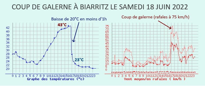 Samedi 18 juin 2022, la station de Biarritz a pulvérisé son record absolu de chaleur avec une valeur maximale de 42,9°C ! En fin d'après-midi, le fameux "coup de galerne" s'est produit en faisant chuter brutalement la température sous la barre des 25°C. À l'arrivée des rafales de vent d'ouest soufflant à 75 km/h, le thermomètre a chuté d'une douzaine de degrés en l'espace de 6 minutes, soit une perte de 2°C par minute - une chute vertigineuse !