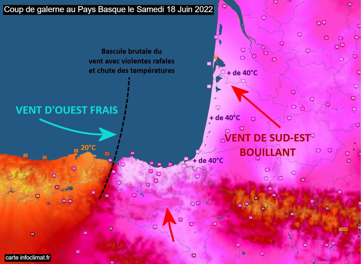 En après-midi du samedi 18 juin 2022, les cartes d'observation de températures permettaient d'observer à merveille la progression du "coup de galerne". Cette bascule du vent au secteur ouest associée à un brutal rafraîchissement a longé la côte du nord de l'Espagne au fil des heures, atteignant en fin d'après-midi la côte basque française où le vent de terre et les températures à plus de 40°C ont été remplacées par un vent océanique puissant et bien plus frais.