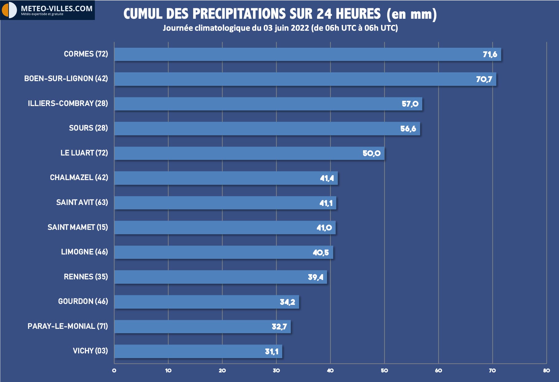 A noter que ces orages ont par endroit apporté d'importants cumul de pluies... qui s'avèrent particulièrement bénéfiques pour les sols en cette période de sécheresse. Dans le Perche, dans la Loire ou encore l'Eure-et-Loir, le cumul a localement dépassé les 50mm sur la journée de ce 03 juin, voire même plus de 70mm. Soit bien davantage en une journée que sur l'ensemble du mois de mai !