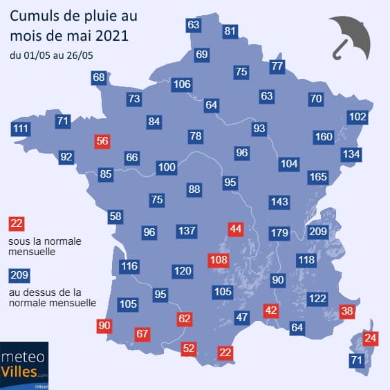 Cumuls de pluie en France entre le 1er et le 26 mai 2021 - Météo Villes