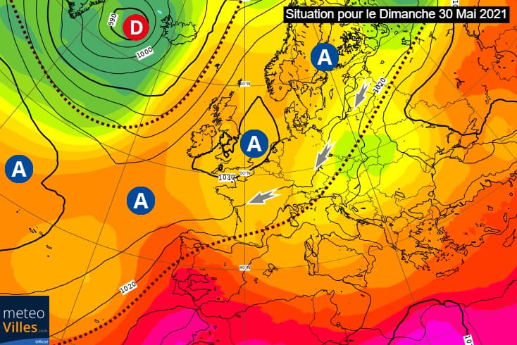 Après nous avoir boudé pendant de longues semaines, l'anticyclone est en train de faire son grand retour. D'ici le week-end des 29 et 30 mai 2021, une barrière de hautes pressions va se constituer entre les Açores et la Scandinavie avec des pressions proches de 1030 hPa vers l'Angleterre et la Mer du Nord. La France va donc bénéficier du retour d'un temps stable, sous l'influence d'un flux continental plus sec.