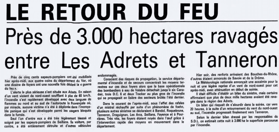 Le 07 juillet 1983, un virulent incendie touche le sud du département, sur le territoire de la commune d'Hyères, où une superficie de 4125 hectares est entièrement dévastée. Mais les 23 et 24 juillet, de nombreux départs de feux incontrôlables sont constatés sur ces deux départements. Plus de 8000 hectares partent en fumée sur les Alpes-Maritimes, tandis qu'un incendie ravage une grande partie du massif de l'Estérel (2450Ha) dans le Var, entre les communes des Adrets et de Tanneron.
