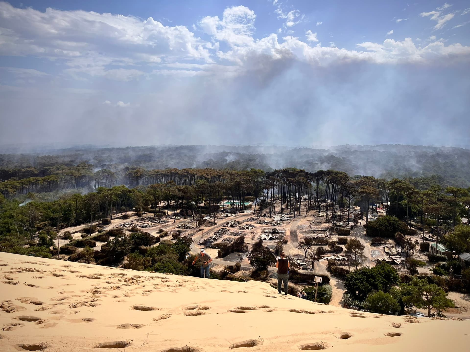 Les campings situés au pied de la Dune du Pilat ont été ravagés par les flammes - photo Sira Thierij / BBC