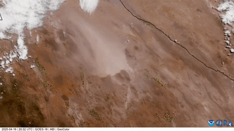 Les tempêtes de sable sont bien souvent observables par satellite. Toutefois, rares sont les images satellites à les mettre en évidence de manière aussi distincte. La tempête de sable a parcouru le nord du Mexique samedi 19 avril 2025, frappant l'État de Chihuahua. Propulsée par de puissants vents de nord-ouest, cette tempête de sable semblait avancer telle une vague déferlante sur l'animation ci-dessous.
