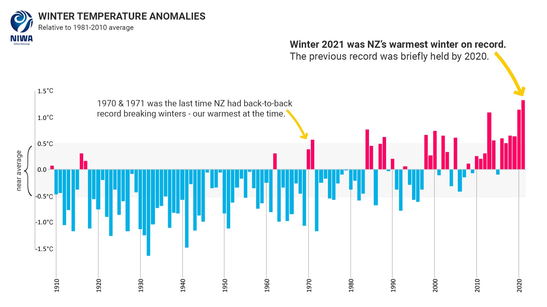 Comparaison des anomalies de températures en hiver depuis 1910 en Nouvelle-Zélande – NIWA