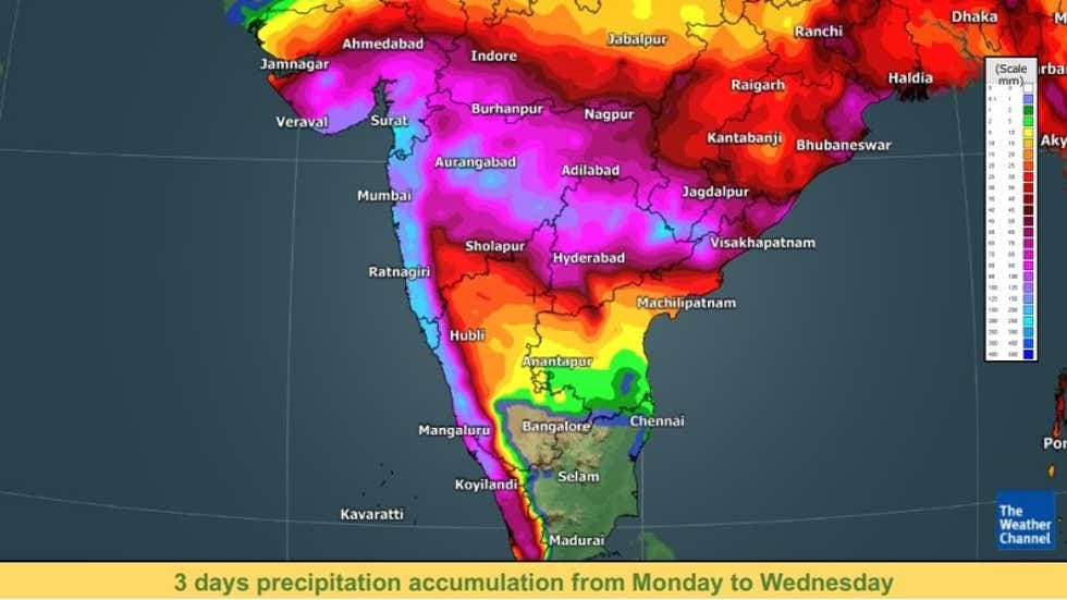Cumuls de précipitations attendus dans les 3 prochains jours sur l'Inde – via TWC India