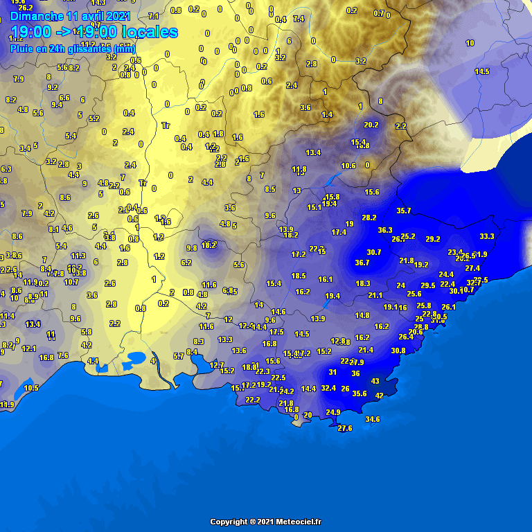 Précipitations observées dans les Alpes du Sud entre le 10 avril 19h et le 11 avril 19h - Meteociel