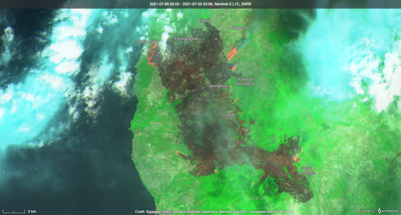 Image satellite infrarouge d'un incendie dans le Nord-Ouest de la Sardaigne - 25 juillet 2021 - Satellite Sentinel-2 via SentinelHub