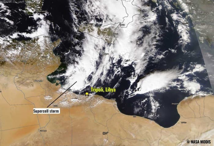 Le 27 Octobre, en marge d’une goutte froide s’écoulant sur la Méditerranée par le Nord, un orage supercellulaire d’une rare violence s’est formé sur le Nord du pays aux abords de la ville de Tripoli.