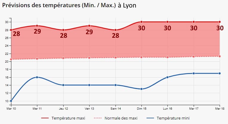 Températures prévues à Lyon du mardi 10 au mercredi 18 mai 2022 - Météo Villes