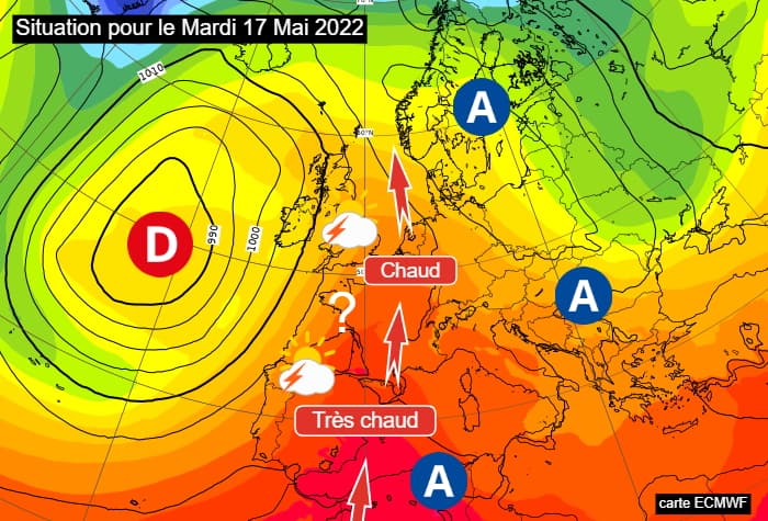 Cette nouvelle accentuation de la chaleur à la mi-mai 2022 sera liée à une migration de l'anticyclone du bassin méditerranéen vers la Scandinavie tandis qu'une dépression dynamique devrait se positionner au large sur l'Atlantique. Ainsi, le flux de sud pourrait s'accélérer en faisant remonter de l'air venu directement du nord de l'Afrique. Cette tendance dominerait la semaine du 16 au 22 mai 2022. Cependant, des incertitudes concernent la proximité des basses pressions et leur capacité à développer (ou non) une instabilité orageuse sur la France.