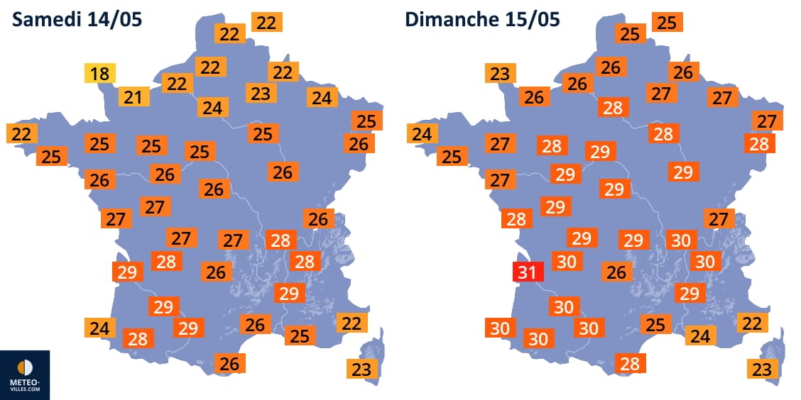 Températures maximales prévues les samedi 14 et dimanche 15 mai 2022 - Météo Villes
