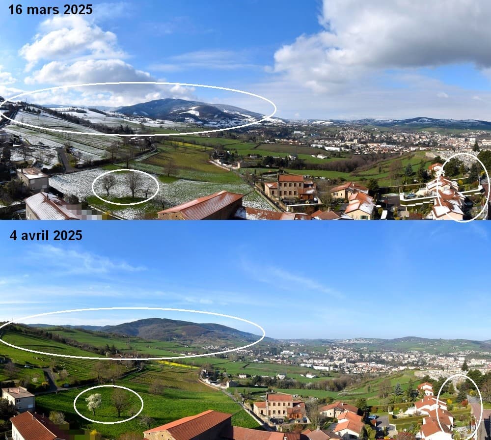 Du côté de Saint-Chamond dans la Loire, la nature verdit également fortement en ce début avril et certaines arbres commencent même à fleurir grâce à un temps majoritairement sec et doux, contrastant fortement avec le temps de la mi-mars où la neige était encore présente dès les premières hauteurs.