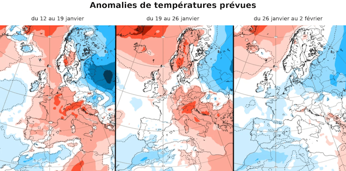Cartes des anomalies de température hebdomadaires entre maintenant et le début du mois de février - modèle météo européen.