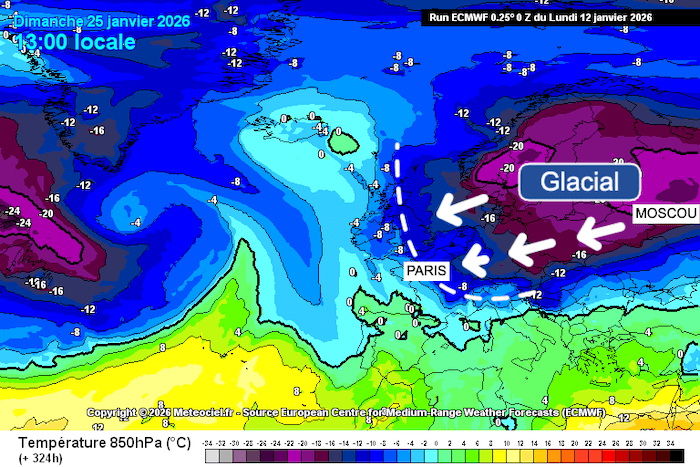 Selon l'un des scénarios du modèle météo européen l'air glacial venu de Scandinavie et de Russie pourrait déferler sur la France à partir du 25 janvier. Notez que dans le même temps, le scénario du modèle météo américain était beaucoup plus nuancé… Tout reste donc possible ! carte Meteociel