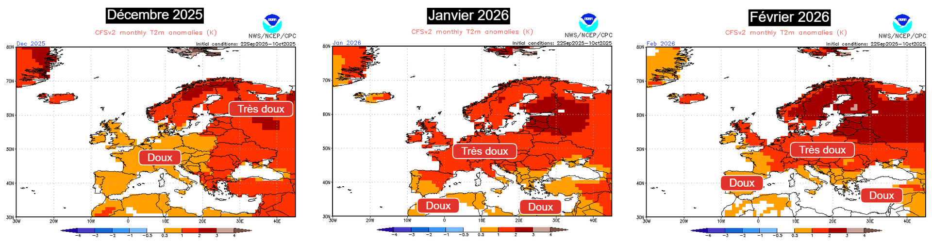 Anomalies de températures pour la période décembre 2025 – février 2026 en Europe – CFS