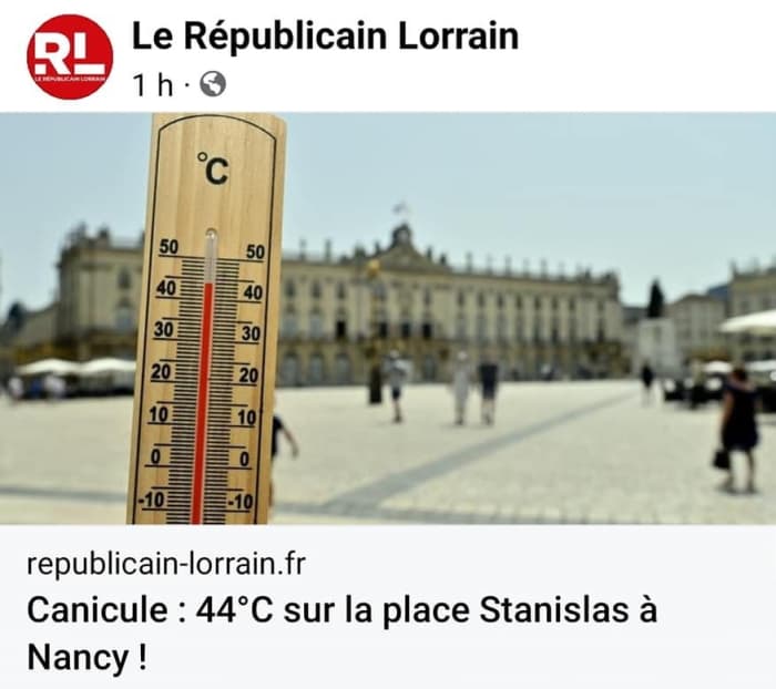 Article au titre trompeur : "44°C sur la place Stanislas à Nancy" le 18 juin 2022 - via Le Républicain Lorrain