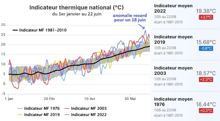 Ceux qui utilisent l'argument de 1976 pour dire que c'était déjà arrivé se trompent : il s'agissait surtout d'une sécheresse remarquable plus que de chaleurs exceptionnelles. Du 1er mai au 22 juin 1976, la température moyenne était de 16,44°C en France contre 19,38°C aux mêmes dates en 2022 ! S'il est vrai que le printemps 2003 était excessivement chaud, le pic de cette canicule de juin 2022 (courbe en bleu foncé) a dépassé largement les pics observés en juin 2003 (courbe en rouge) ! En 2003, le maximum de la chaleur s'était surtout produit en août. Quant à 2019, sa canicule historique et ses records étaient survenus à la toute fin juin et le printemps avait même été plutôt frais...