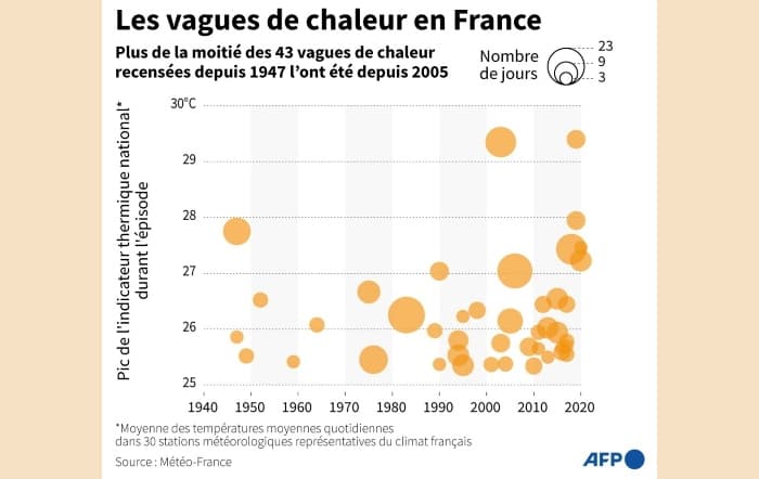 Les vagues de chaleur en France de 1940 à 2020 - infographie AFP