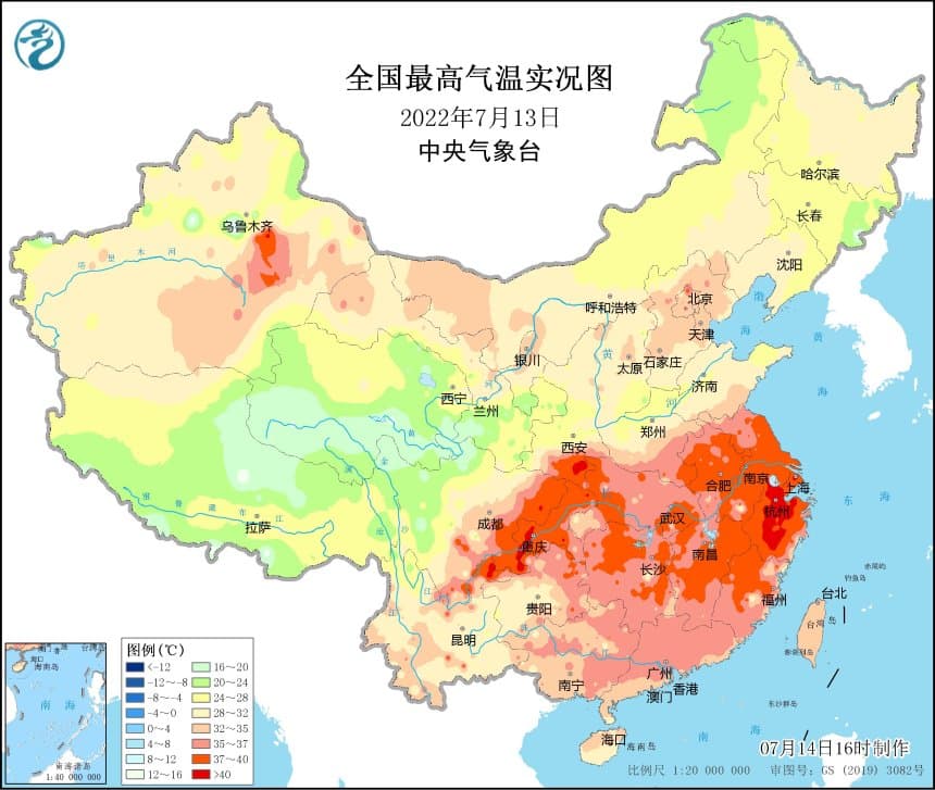 C'est néanmoins plus au Sud que la chaleur est la plus intense et la plus durable. La Chine vit depuis plusieurs semaines l'une des vagues de chaleur les plus intenses de son histoire avec de très nombreux records de chaleur tombant chaque jours depuis juin sur le pays. Le 12 juillet, les 40°C les plus précoces jamais observés ont été relevés à Hangzhou et plusieurs records absolus ont été battus comme à Yxing (41,3°C), Heijang (42°C) ou encore Changxing (41,3°C). La chaleur est également exceptionnelle durant la nuit avec par exemple pas moins de 33°C à Chongqing durant la nuit du 11 au 12 juillet dernier.