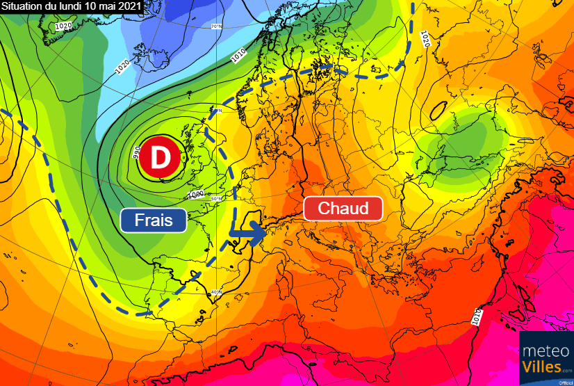 Situation atmosphérique du lundi 10 mai 2021 – ECMWF, modifié par Météo-Villes