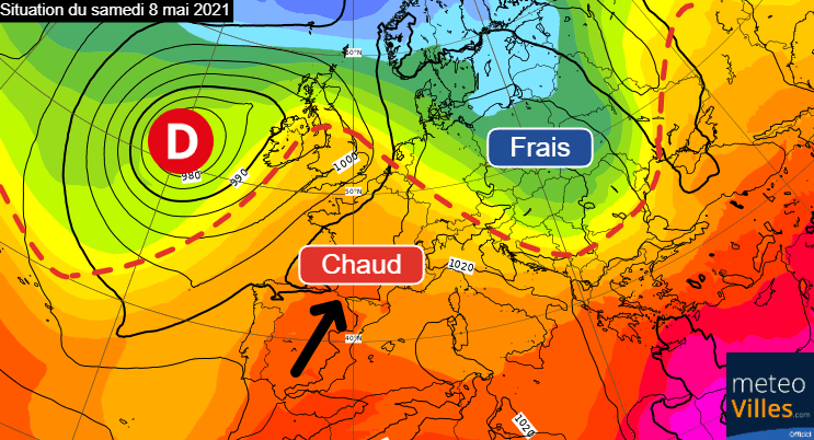 Situation atmosphérique de ce samedi 8 mai 2021 – ECMWF, modifié par Météo-Villes