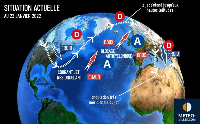 Avant toute chose, il est important de rappeler ce qu'est le courant jet (ou jet stream en anglais). Il s'agit d'un couloir de vents puissants évoluant à haute altitude (vers 9000m) et circulant à la frontière entre l'air froid polaire et l'air chaud subtropical en faisant le tour de l'hémisphère. On note deux couloirs de courant jet polaire, un dans l'hémisphère nord et un dans l'hémisphère sud au niveau des latitudes tempérées. Ce courant jet n'évolue pas toujours sur les mêmes régions car il n'est pas rectiligne et subit des ondulations, à l'origine de la variabilité du temps.