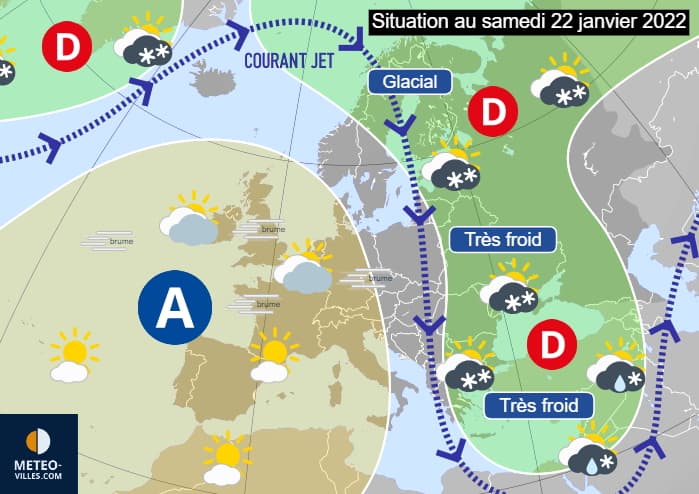 Situation à échelle continentale et courant jet le samedi 22 janvier 2022 - Météo Villes