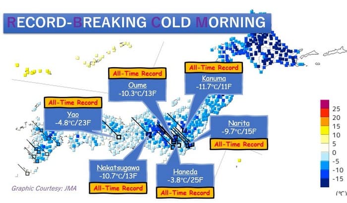 Outre les chutes de neige, ce sont également les basses températures qui ont fait parler d'elles ce week-end. Plusieurs stations du centre et du sud du pays ont en effet battu des records absolus de froid ce 9 février au matin et 90M des stations du territoire japonais sont descendues sous 0°C.