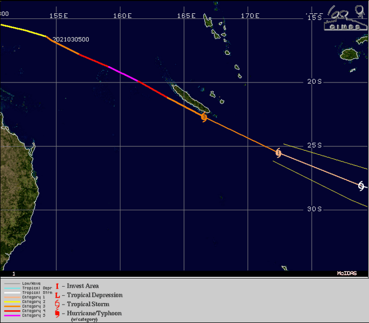 Trajectoire et intensité du cyclone Niran au niveau de la Nouvelle-Calédonie - 6 mars 2021 - CIMSS