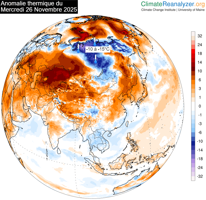 Les températures actuelles en Sibérie se situent en dessous des moyennes de saison. Au mercredi 26 novembre 2025, la Sibérie est d'ailleurs la région du monde qui enregistre l'anomalie thermique négative la plus prononcée avec des températures s'abaissant parfois 10 à 15°C en dessous des moyennes saisonnières. Malgré tout, on ne parle pas de record. Dans ces régions, il a déjà encore plus froid à plusieurs reprises en cette saison. À Delyankir, les -50,7°C restent loin du record d'un mois de novembre qui est de -56,3°C, soit 5,6°C plus bas.