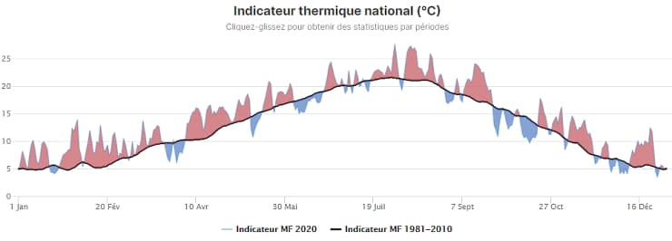 En s'éloignant de ce mois d'octobre pour une vision plus globale de 2020, on se rend compte que les anomalies chaudes ont été omniprésentes durant l'année. En réalité, seul le mois d'octobre a terminé avec un déficit thermique alors que les 11 autres mois furent plus chauds que la normale. D'ailleurs, l'année 2020 est devenue la plus chaude en France depuis le début des relevés !