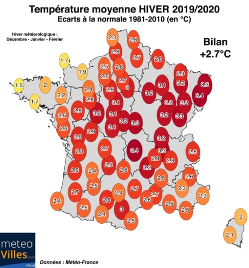 Écart thermique à la normale sur les 3 mois de l'hiver 2019-2020 - Météo Villes