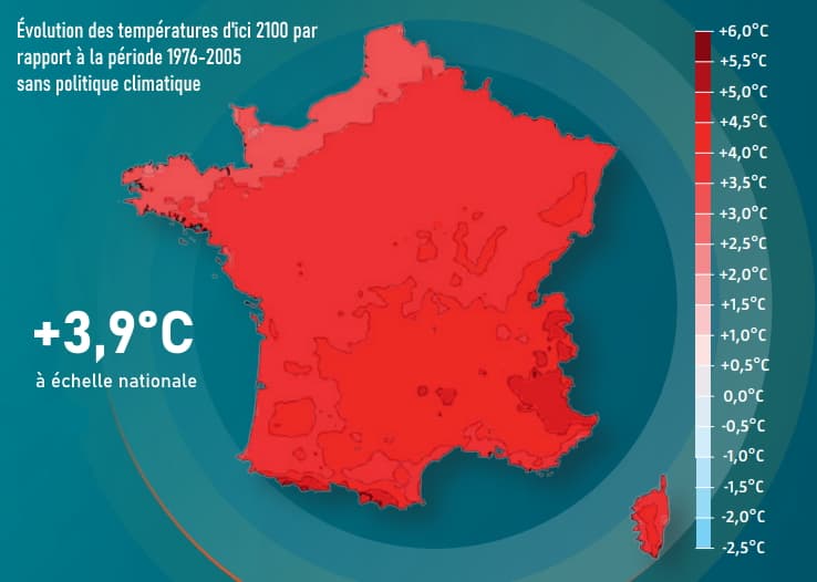 Météo France a simulé l'évolution des températures en France d'ici la fin du siècle selon deux scénarios. Le premier, qui prend en compte une politique climatique efficace et immédiate, montre une augmentation de +2,2°C d'ici 2100. Le nombre de jours de gel en plaine serait alors divisé par deux et la durée d'enneigement significatif en moyenne montagne réduite de plusieurs dizaines de jours par saison. Les sécheresses seraient aussi plus longues et on compterait 10 à 15 jours supplémentaires de canicule par an.