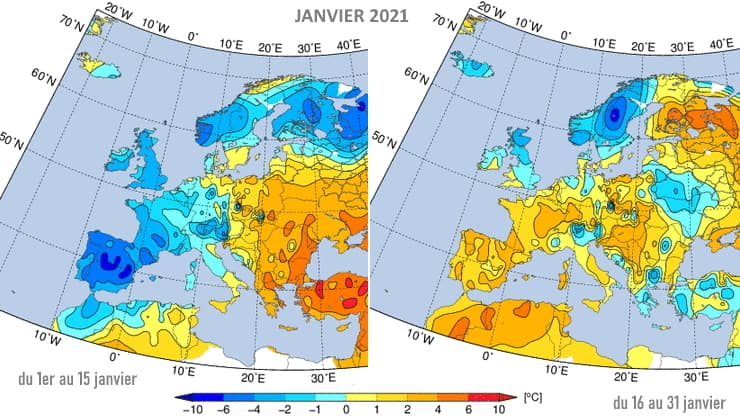 Anomalies thermiques en Europe sur les deux quinzaines de janvier 2021 - via JMA