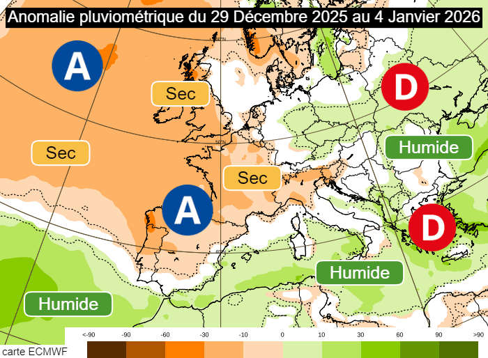 Ce scénario d'un flux de nord-ouest modérément froid et avec des précipitations discrètes, lié à l'influence de l'anticyclone atlantique sur la France, est désormais repris par tous les modèles de prévisions. Autant dire que l'hypothèse d'une coulée polaire avec une neige abondante en plaine sur la France semble désormais très peu probable. D'ailleurs, les modélisations pour la semaine du passage à la nouvelle année envoient désormais un signal sec assez net sur l'ouest de l'Europe, dont la France. Cette anomalie anticyclonique pourrait même se prolonger tout au long de la première décade de janvier 2026.