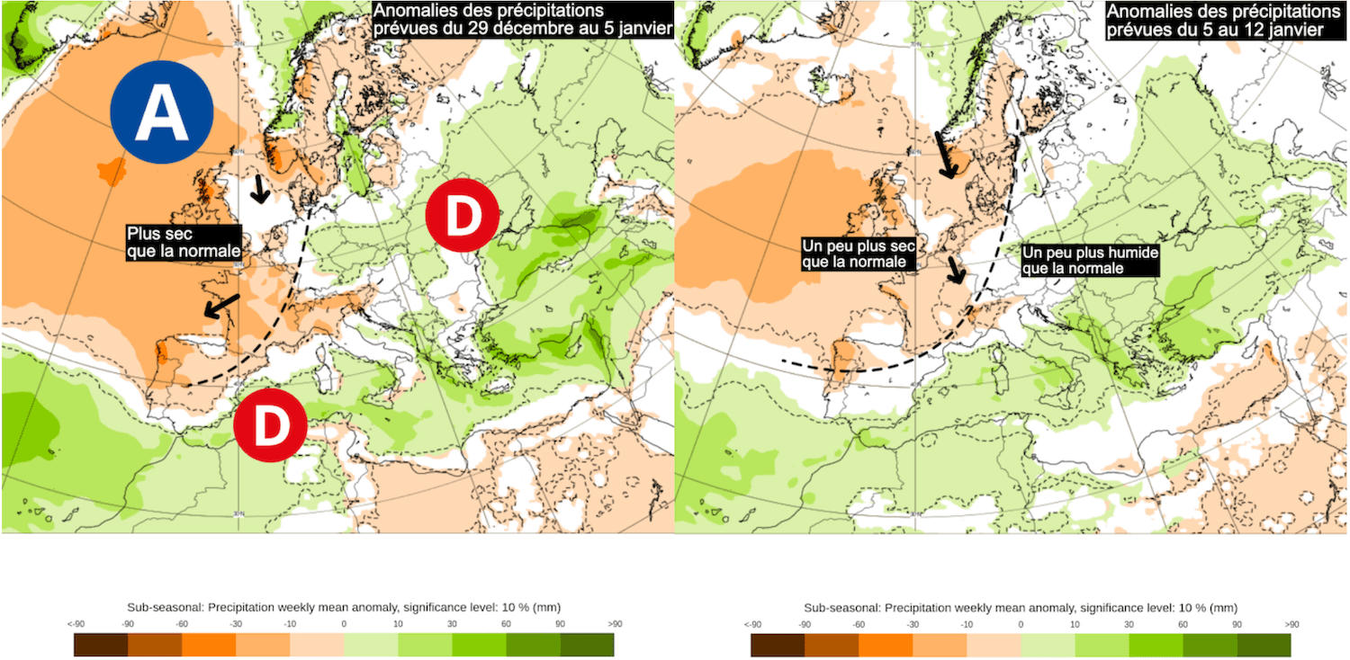 En raison de la persistance de l'anticyclone sur la partie nord-ouest de l'Europe, cette anomalie sèche persiste rat sur une grande partie de la France jusqu'au début du mois de janvier. Par la suite, le courant du Nord deviendra plus humide, mais les perturbations devraient rester modérées et ne pas entraîner de précipitations importantes, nous maintenant ainsi près des normales.