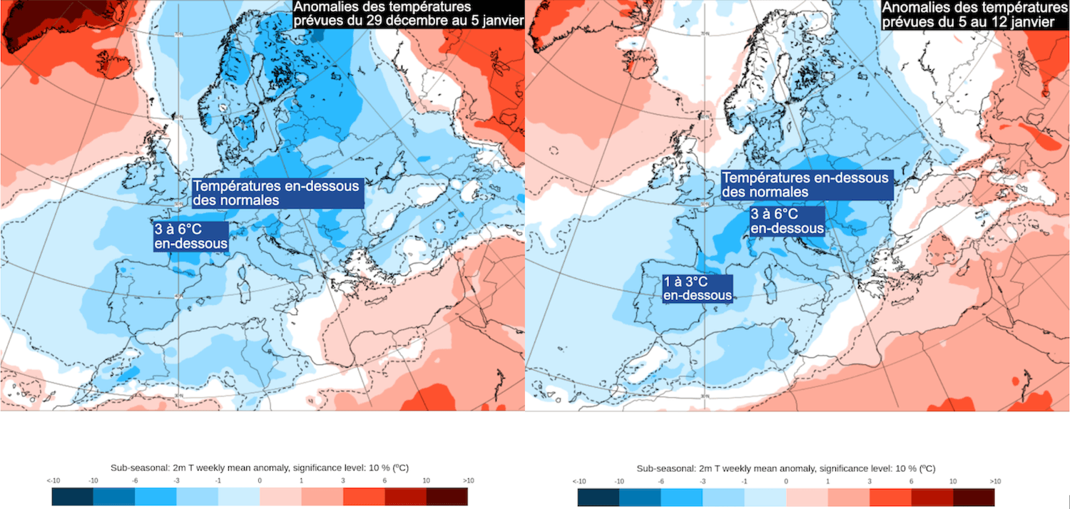Anomalies des températures prévues sur l'Europe entre le 29 décembre et le 12 janvier