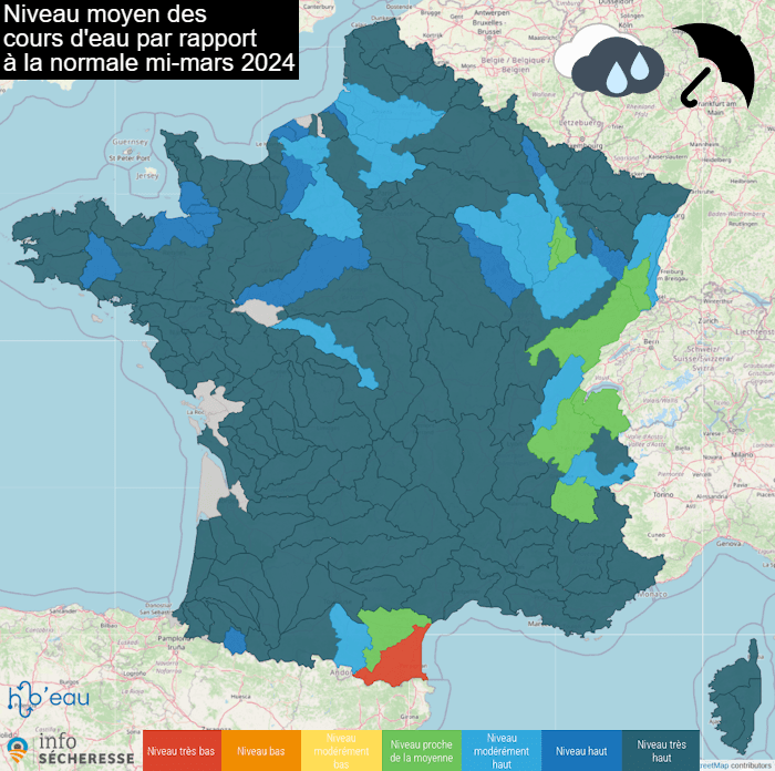 Niveau moyen des cours d'eau par rapport à la normale à la mi-mars 2024 - via Info Sécheresse