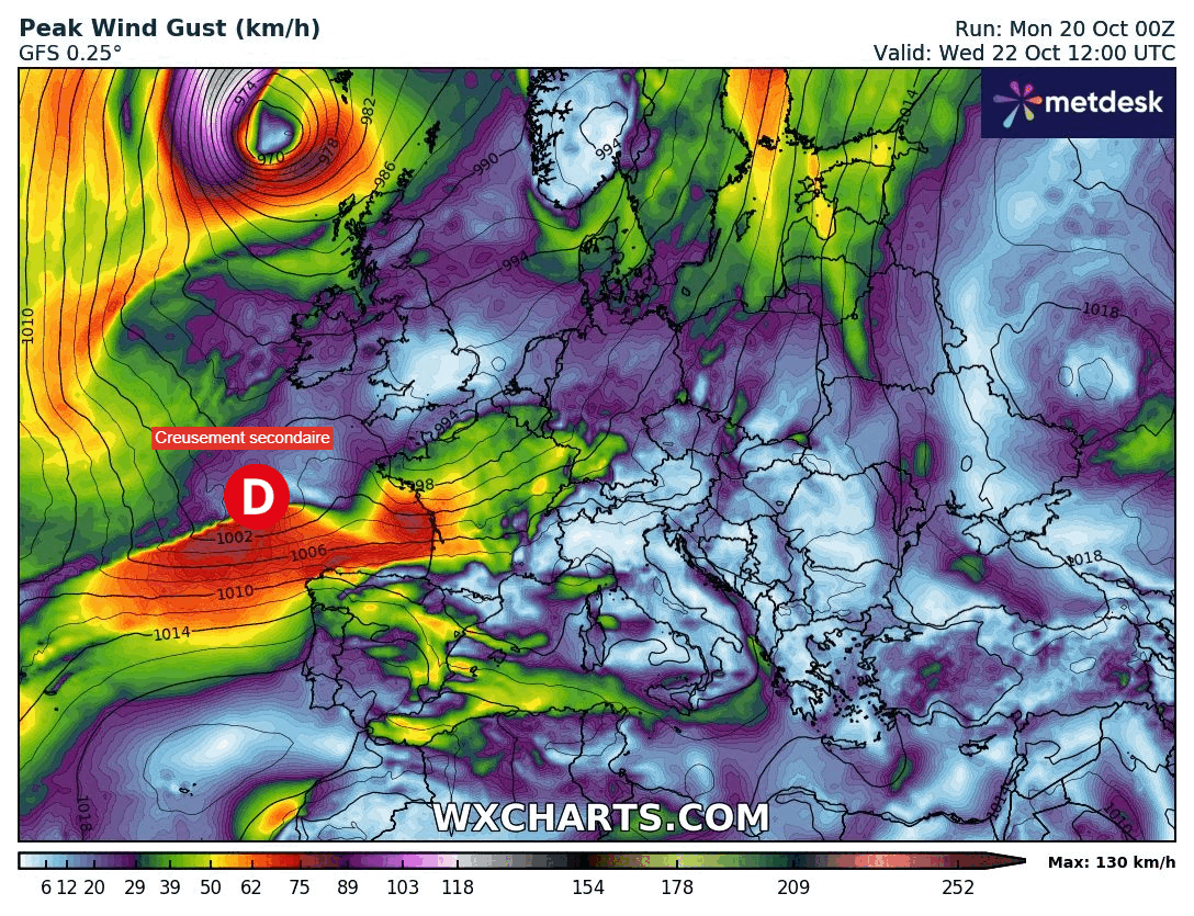 Évolution du risque de tempête sur la France entre mercredi 22 et jeudi 23 octobre 2025 – Modèle GFS via WX CHARTS