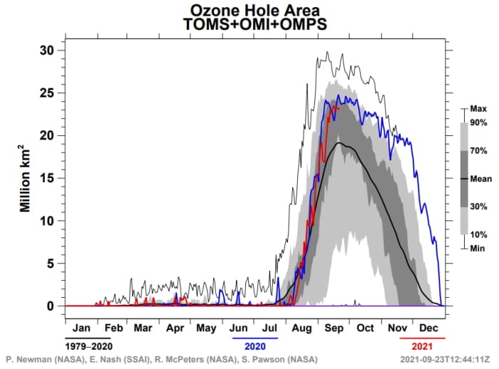 Selon les spécialistes, le trou de la couche d'ozone de cette fin d'année 2021 pourrait perdurer de manière anormalement durable, à l'image de celui de la fin d'année 2020 qui ne s'était dissipé qu'à la fin du mois de décembre, atteignant des niveaux records dès la fin novembre.