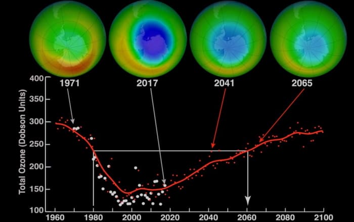 Les scientifiques estiment que le trou de la couche d'ozone se sera considérablement réduit d'ici 2050 et qu'un retour à la normale serait envisageable entre 2060 et 2070. En attendant, nous pouvons déjà nous réjouir que la communauté internationale soit intervenue à temps - sans quoi le trou de la couche d'ozone aurait été de plus en plus profond et étendu (y compris aux hautes latitudes de l'hémisphère nord) avec pour conséquence une explosion du nombre de cancers de la peau...