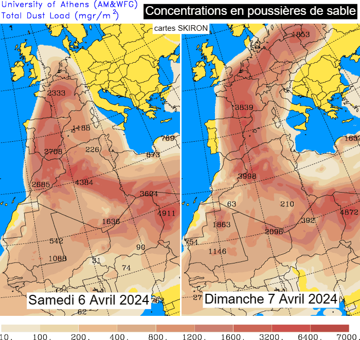 Concentrations de sable du Sahara prévues les samedi 6 et dimanche 7 avril 2024 - via SKIRON