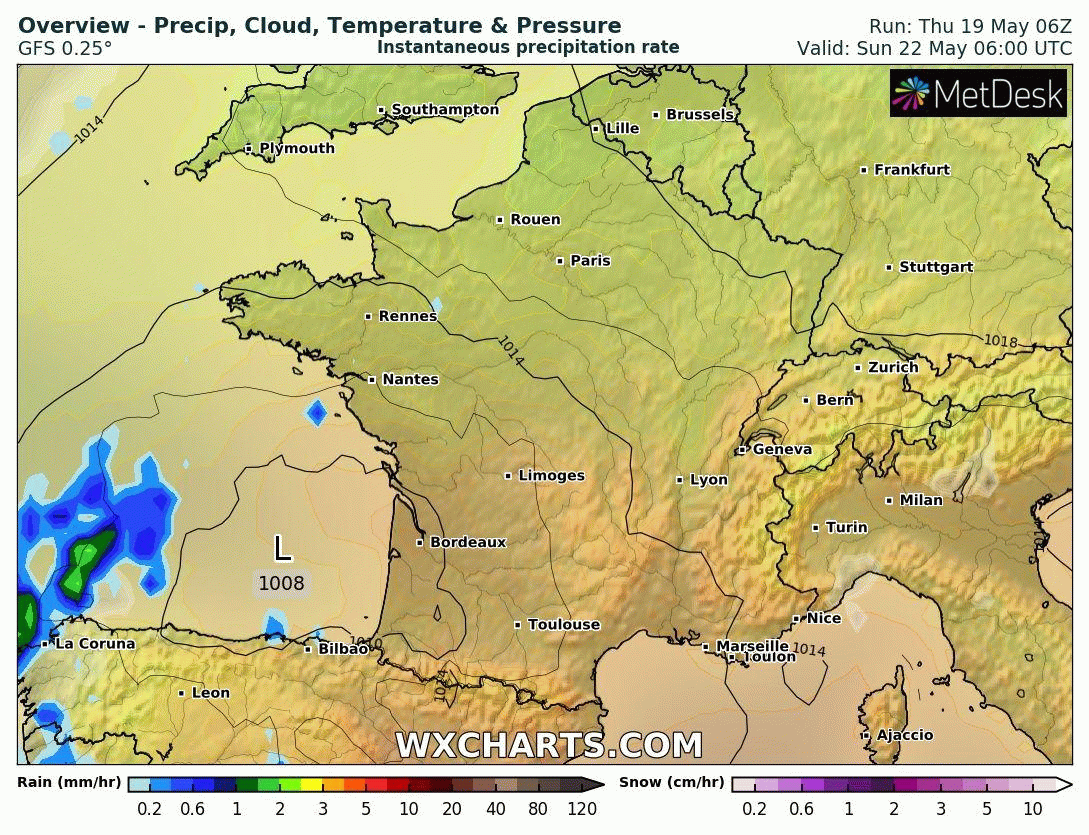 Animation du risque des champs de pression et du risque de précipitation du dimanche 22 au mardi 24 mai 2022 – Modèle GFS via WX CHARTS