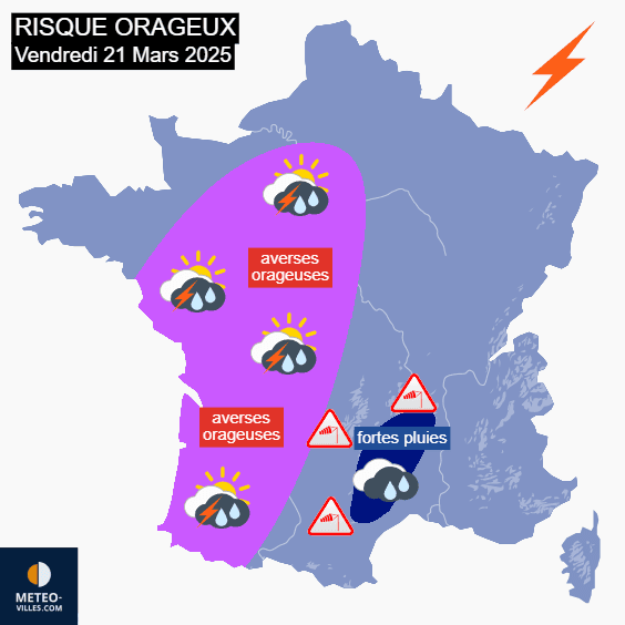 Risque orageux valable pour le vendredi 21 mars 2025 - Météo Villes